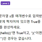 '(' 일때는 카운트를 1 올리고 ')' 일때는 카운트를 1 내리면서카운트가 음수값이면 반복문을 종료하고 False를 반환한다.반복문이 종료했을때는 '('의 갯수와 ')'의 갯수가 같을때 True를 반환한다.문제풀이 def is_pair(s): cnt = 0 pair = [(i) for i in s if i in ('(',')')] for rpt in range(0, len(pair)): if pair[rpt] in '(': cnt += 1 elif pair[rpt] in ')': cnt -= 1 if cnt < 0: return False return pair.count('(') == pair.count(')') # 아래는 테스트로 출력해 보기 위한 코드입니다. print( is_pair("(hello..