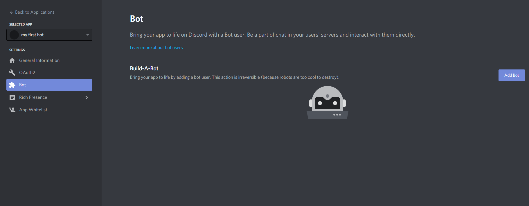 봇이 만들어지면 Bot탭으로 들어와 Add Bot을 눌러줍니다.