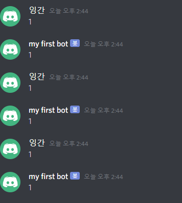 client.run('token')사용자가 메시지를 보내면 봇이 다시 그 메시지를 출력하는 간단한 예제입니다.